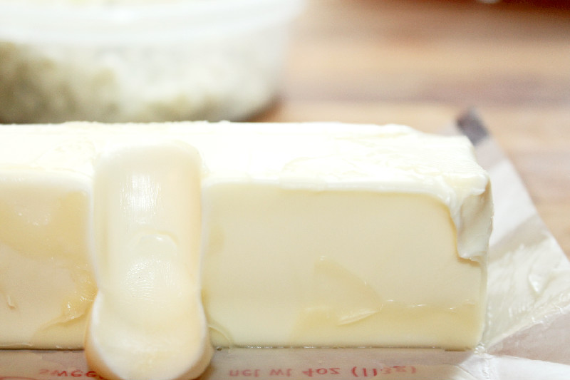 To make the gorgonzola butter sauce, allow butter to sit out for an hour to reach room temperature. You should be able to slide your finger down butter just like this.