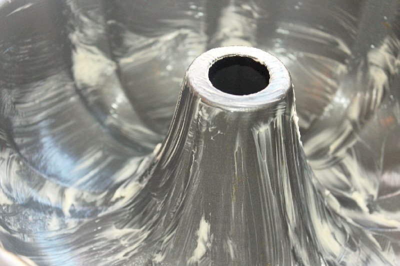Pour batter into bundt pan. Tap pan against counter to remove air bubbles. Sit batter in the middle of the oven and turn oven on to 350 degrees. Bake until golden brown, use a wooden bamboo skewer to check for texture after 1 hour. If batter is still not cooked bake another 10 minutes. Remove from oven and allow to cool 5 minutes.