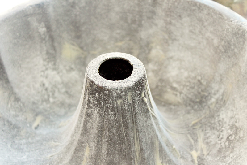 Use cake flour to flour the pan. Do not use cooking spray because it will make the cake batter not rise as high.