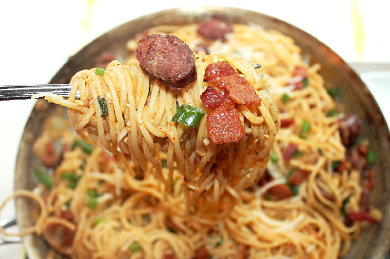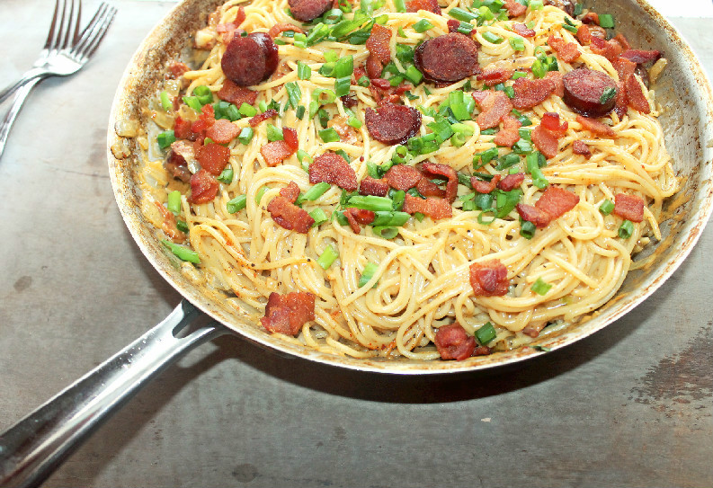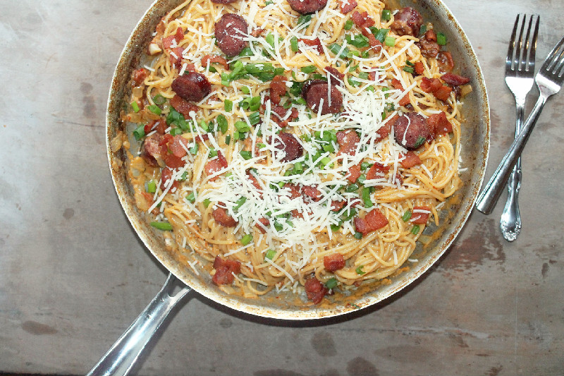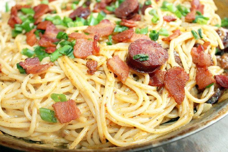Traditional Carbonara would include egg, Creole Carbonara replaces the egg, which gives this dish a great richness, with sharp cheddar cheese.
