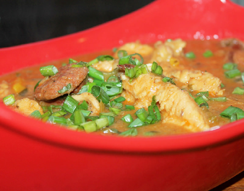 INGREDIENTS: 4 boneless chicken breasts, sliced into tenders 1 lb. smoked hot sausage, sliced about 1” thick 1/2 cup extra virgin olive oil 1/2 cup flour 2 tbsp. butter 1/2 c. chopped white onion 1/2 c. chopped red onion 3/4 c. chopped celery 1/2 c. chopped bell pepper 1/4 c. diced garlic 2 bay leaves 1 small can of hot tomato sauce 32 oz. chicken broth use 1/2 this amount if cooking in a crock pot. 1 tbsp. oregano, dried 1 tbsp. creole seasoning 1 tbsp. garlic powder 1 tbsp. onion powder ½ tbsp. paprika ½ tbsp. chili powder ½ tbsp. Italian seasonings 1 tsp. thyme, dried 1 tsp. cayenne pepper (optional) 1/2 cup sliced green onions 1/4 cup chopped parsley Hot rice to serve with. Directions: In a large pot or stock pot, heat oil over medium high heat. Mix seasoning blend up and set aside. Season chicken breasts with about 3 tablespoons of seasoning blend. Sauté chicken in oil until browned on each side, remove from pot and set aside. Add butter to pan and allow to melt. Add flour to oil and butter mixture and whisk well for about 5-7 minutes making a brown roux. Watch carefully not to burn roux, lower heat if needed. Add all the vegetables and 1 tablespoon of seasoning blend to the roux cook about 3-5 minutes. Add bay leaves and tomato sauce, and chicken broth mixing well. Bring mixture to boil and reduce to simmer. Add chicken breasts, and sausage to the sauce, cover pot and allow to cook about 30 minutes, stirring occasionally. Serve with hot rice. |