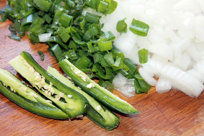 I added a diced onion, 1/2 bunch of green onion and a jalapeno. Seed the jalapeno if you want to cut back on the spice.