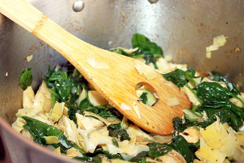 Add spinach and cook until wilted about 7 minutes. Add chopped artichoke and cook for about 3 minutes. Add cheeses and mix well. Allow mixture to cool about 10 minutes, stir in sour cream and mayonnaise.