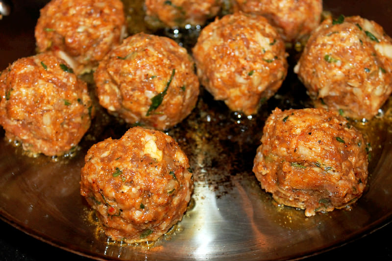 Form back into a ball shape and set aside. In a large skillet add 4 tablespoons of olive oil over medium heat, add meatballs and brown on all sides about 2-3 minutes per side, remove and set aside. Repeat until all meatballs are browned.