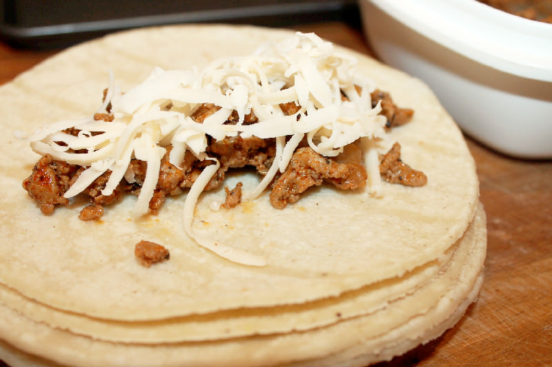 Place about 1 tablespoons of cooked meat and 1/2 tablespoonful of your favorite cheese. I chose Machego but jack cheese works well.
