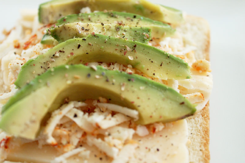 Assemble sandwich by placing manchego, enchilado, and Colby jack cheese on bottom of one slice of bread. Top with sliced avocados, peppers and slice of white cheddar cheese. Top with remaining bread and repeat.