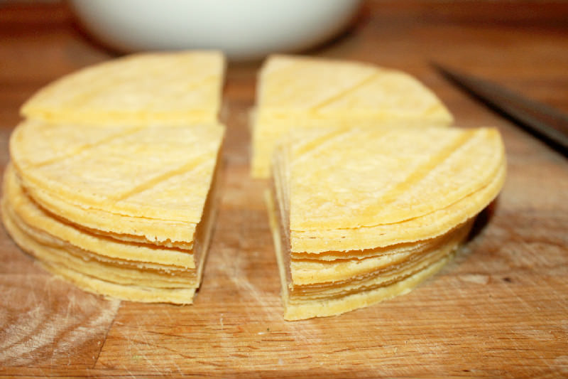 - Prepare tortillas by heating cooking oil in a pan over medium heat. Fry tortillas about 2 minutes are until golden brown, remove from pan, drain, sprinkle a pinch of salt and repeat.