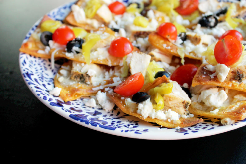 I topped my tortilla chips with feta, mozzarella, chicken, olives and peperoncini. Broil until cheese starts melting.