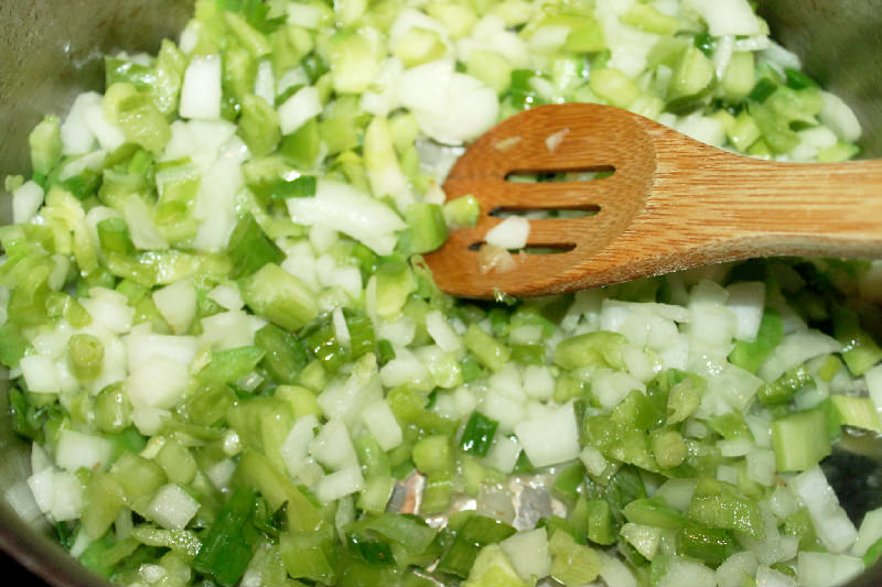 - To prepare red sauce, heat olive oil in a sauce pan over medium heat. Add onions, bell pepper, and celery, saute for about 5 minutes. Add seasonings and garlic and cook 1 minute more.