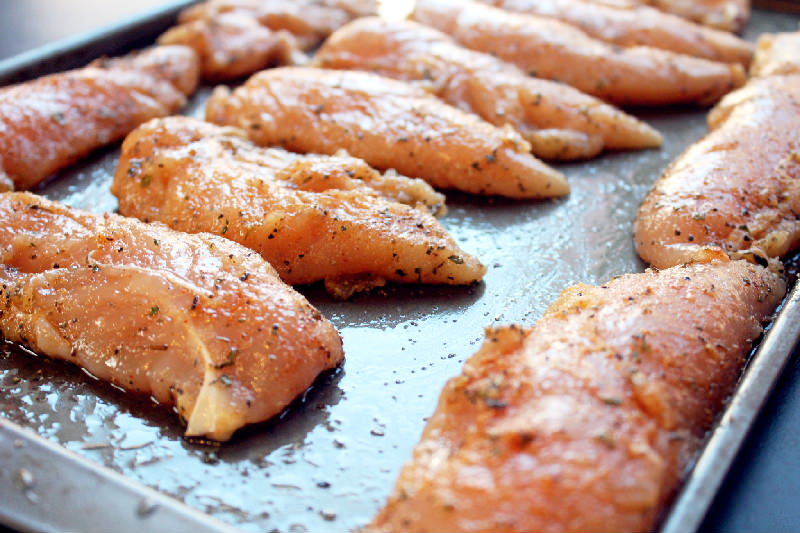 - Rinse chicken, pat dry and place on a baking sheet. Add olive oil and seasonings to chicken and mix well. Bake chicken at 375 degrees for 15 minutes. Remove chicken from oven and set aside.