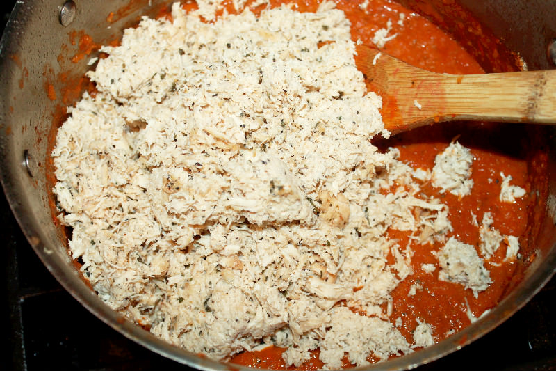 Don’t puree it, but give it a course chop, then add the chicken to the tomato/hot sauce mixture, stir well and set aside.