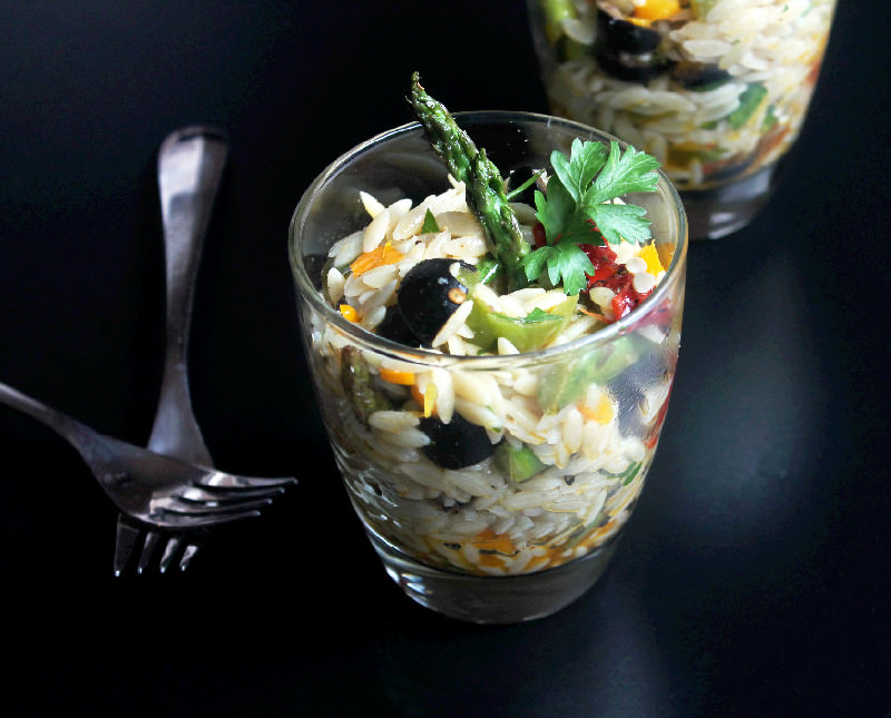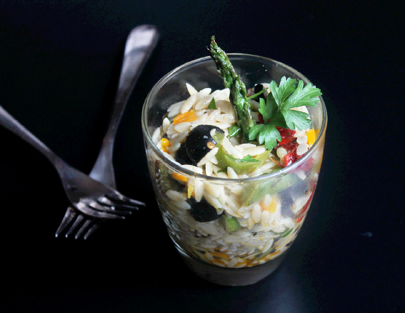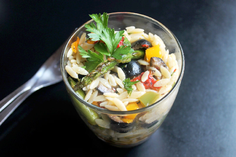 I made a few adaptations to Orzo Salad with Peppers and Olives which included adding asparagus and some pre-roasted red peppers.