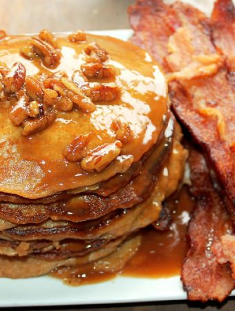 Sweet Potato Pie Pancakes with Pecan Praline Syrup